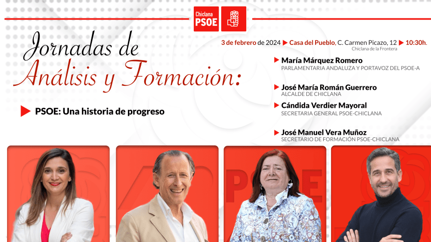 El PSOE de Chiclana celebra este próximo sábado 3 de febrero las Jornadas de Análisis y Formación ‘El PSOE: Una historia de progreso’. Unas jornadas que darán inicio a las 10.30 horas en la Casa del Pueblo y que contarán con la presencia de la parlamentaria y portavoz del PSOE de Andalucía, María Márquez Romero; el alcalde de Chiclana, José María Román; la secretaria general del PSOE de Chiclana, Cándida Verdier; y el secretario de Formación, José Vera.
